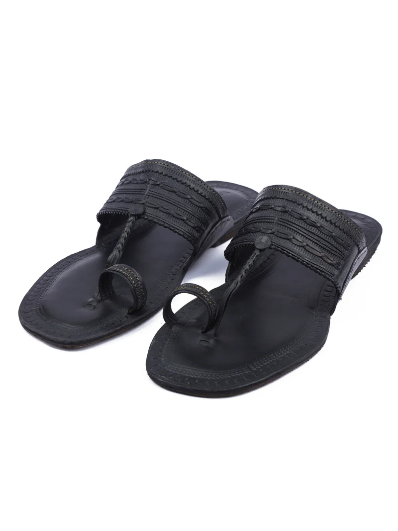 Men's Black Kolhapuri Chappal with Artisan's Design Upper, Flat Tip Shape, Cushioned Bottom with Manual Leather Chord Stitching and Anti-Slip TPR at Bottom Step into classic simplicity with our men's black Kolhapuri chappals. These aren't just footwear; they are a tribute to a rich heritage, re-im