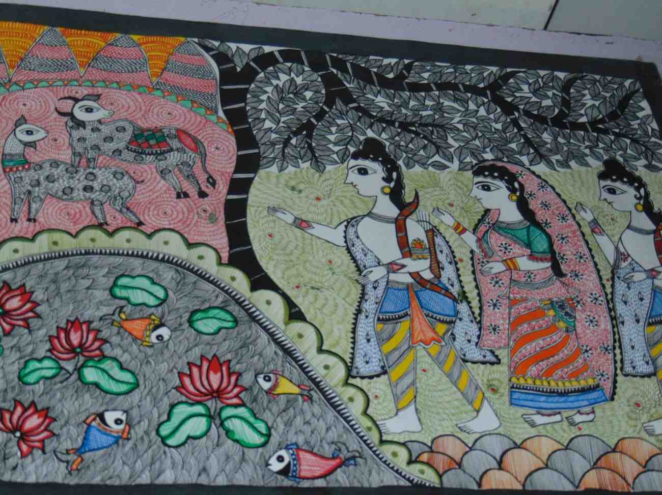 Three Central Figures: Three human figures, traditionally identified as Lord Rama, his wife Sita, and his brother Lakshmana, shown in a natural setting. Rama is typically depicted holding a bow (though not clearly visible here, his posture suggests it), Sita is in the middle with traditional attire, and Lakshmana follows. Their stylized features, large eyes, and intricate clothing patterns are characteristic of Madhubani art. Tree (Tree of Life/Forest): A prominent tree, often symbolizing the forest they dwelled in during exile, or a generic "Tree of Life" motif. The leaves are intricately patterned in black and white, contrasting with the colorful figures. Animals: On the left, stylized deer/antelopes are shown, often associated with forest scenes and sometimes symbolizing the innocent nature of the forest dwellers. Water Body with Fish and Lotus: In the foreground, a pond or river with fish and lotus flowers, representing purity, sustenance, and the natural environment. Traditional Madhubani Patterns: The entire composition is filled with the characteristic intricate line work, geometric and organic patterns (like hatching for the ground, waves for water, and floral motifs), and a vibrant color palette with bold outlines. Hilly/Terrain Backdrop: The upper left and lower right show stylized hills or rocky terrain. Incident/Symbolism in Brief: This painting depicts a fundamental scene from the Hindu epic Ramayana, specifically the period when Lord Rama, accompanied by his devoted wife Sita and loyal brother Lakshmana, spent fourteen years in exile in the forest. This "incident" is not a single dramatic event but rather a phase of their journey that tests their endurance, devotion, and adherence to dharma (righteousness). The natural elements like trees, animals, and water symbolize their life in the wilderness, away from Ayodhya, and their connection to nature. The scene evokes themes of devotion, sacrifice, righteousness, and the challenges faced