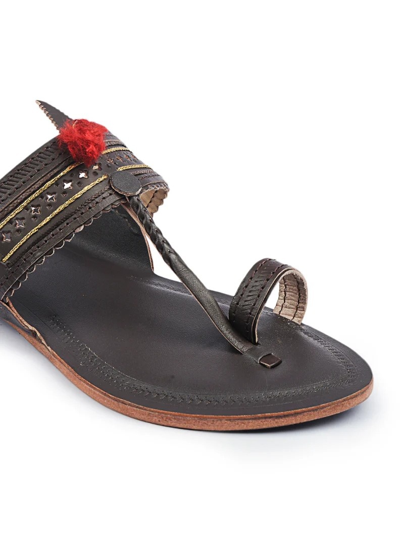 Chic - Brown Simple and Sweat Kolhapuri Leather Chappal for Women with Red Kolhapuri Gonda, Cusion (Padded) Bottom Anti-Slip Aerosole Rubber at Heel
