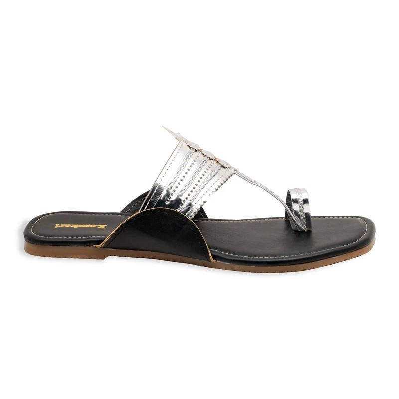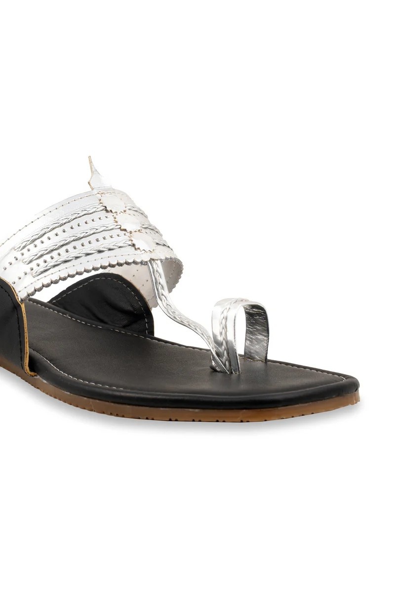 ilverfox Kolhapuri Chappal for Women with Silver upper with silver braids, cushioned bottom and anti-slip TPR at the bottom. The Silverfox Kolhapuri Chappal for women, crafted by Korakari, is a stunning blend of tradition and modern style. Handmade with premium leather, these sandals embody the r