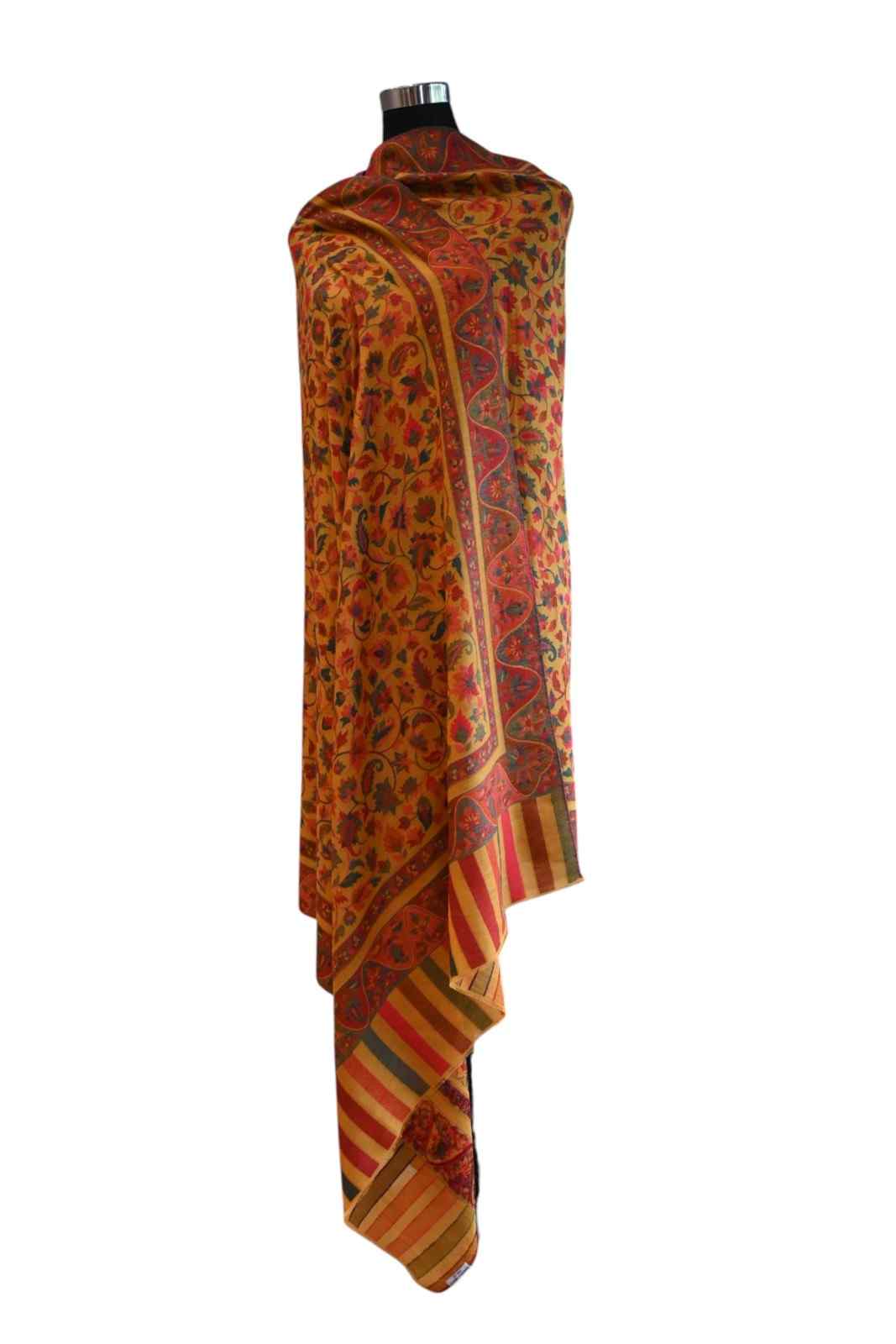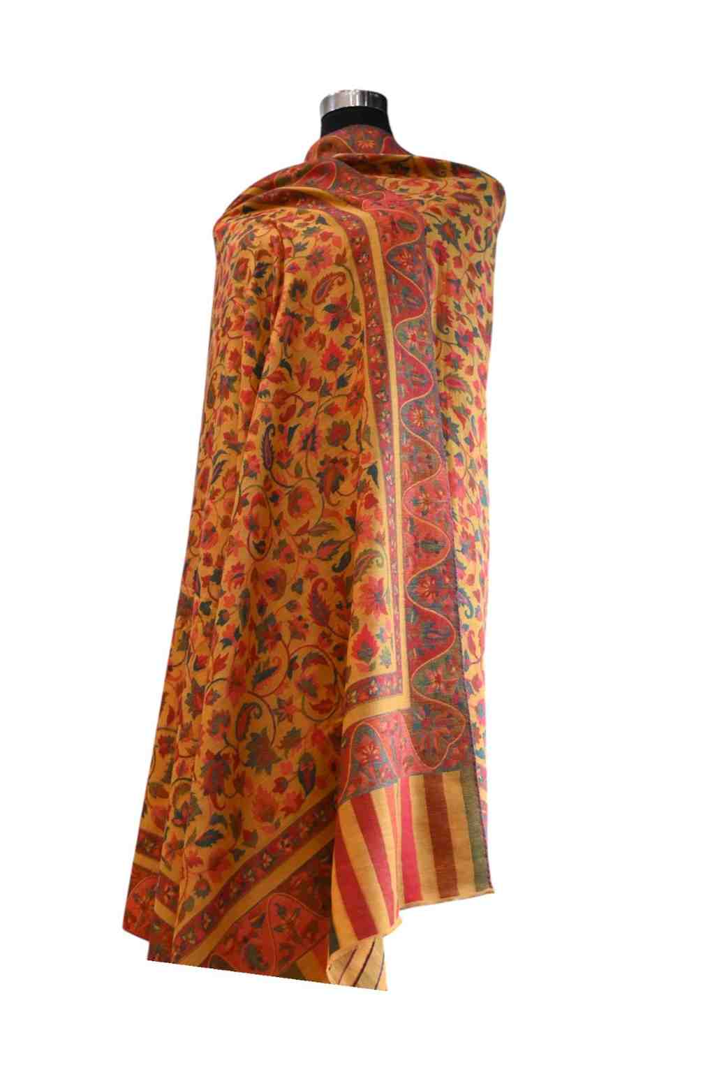 Radiate warmth and tradition with this captivating Himroo Shawl, featuring a golden yellow base beautifully accented by deep red, olive green, and subtle blue floral motifs. The bold, handwoven patterns and striking striped border evoke a sense of festive grandeur and timeless artistry. Soft, lightw